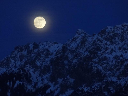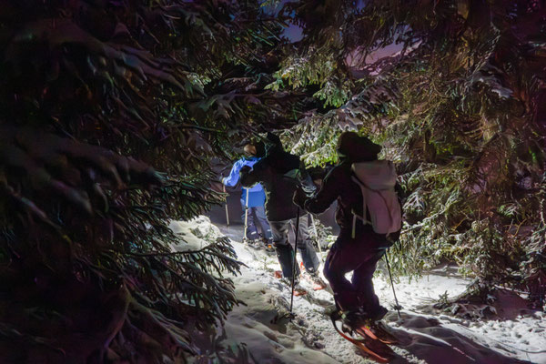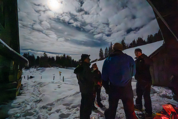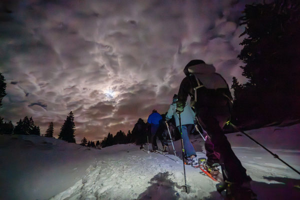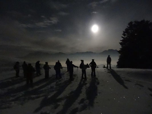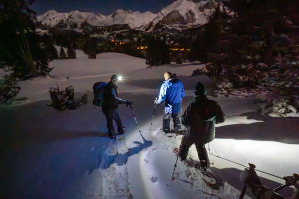 Gemütlich wandern wir durch den Schnee und lassen uns von der mondbeleuchteten Winterlandschaft verzaubern. Die Ausblicke in die umliegende Bergwelt sind beeindruckend. Unterwegs stärken wir uns mit einem warmen Apéro unter freiem Himmel. Auf- und Abstiege über Alpweiden wechseln sich ab. Die leichte Schneeschuhwanderung mit kurzen Passagen in steilerem Gelände dauert ungefähr zwei Stunden und ist für Schneeschuhläuferinnen und Einsteiger mit normaler Fitness geeignet.