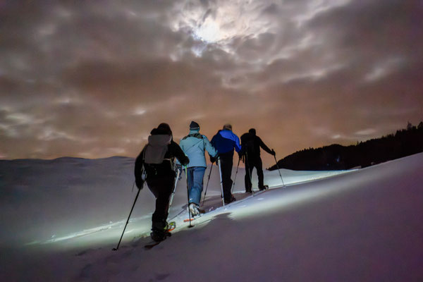 Gemütlich wandern wir durch den Schnee und lassen uns von der mondbeleuchteten Winterlandschaft verzaubern. Die Ausblicke in die umliegende Bergwelt sind beeindruckend. Unterwegs stärken wir uns mit einem warmen Apéro unter freiem Himmel. Auf- und Abstiege über Alpweiden wechseln sich ab. Die leichte Schneeschuhwanderung mit kurzen Passagen in steilerem Gelände dauert ungefähr zwei Stunden und ist für Schneeschuhläuferinnen und Einsteiger mit normaler Fitness geeignet.